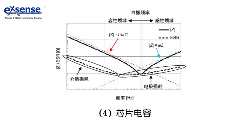 |Z|和ESR變?yōu)椋?)中曲線的原因如下:低頻率范圍的|Z|與理想電容器相同,都與頻率呈反比趨勢減少。ESR值也顯示出與電介質(zhì)分極延遲產(chǎn)生的介質(zhì)損耗相應(yīng)的特性。而在共振點附近:頻率升高,則|Z|將受寄生電感或電極的比電阻等產(chǎn)生的ESR影響,偏離理想電容器(紅色虛線),顯示最小值。|Z|為最小值時的頻率稱為自振頻率,此時|Z|=ESR。若大于自振頻率,則元件特性由電容器轉(zhuǎn)變?yōu)殡姼?,|Z|轉(zhuǎn)而增加。低于自振頻率的范圍稱作容性領(lǐng)域,反之則稱作感性領(lǐng)域。
